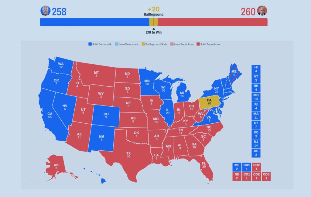 But the Electoral College system, in which states wield influence based on a formula that ultimately corresponds to the sizes of their populations, still gives Trump hope of piecing together a slender path to the 270 votes needed to win. Let’s not forget that Trump polled nearly 3.5m votes less than Hillary Clinton last time, and still won due to winning the right key states!