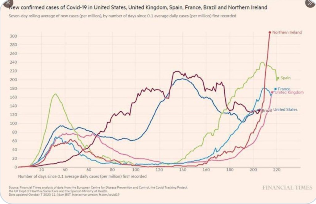 A disturbing graph tracking Northern Ireland’s performance in combating Covid-19 has been doing the rounds online in recent days. An interactive data analysis from the Financial Times allowed for a basic international comparison of countries and regions by showing new confirmed cases in the last seven days per million people. When Northern Ireland was included on the graph, it suggested we were currently among the worst for infection rates in the world! As bad as this seems, it doesn’t give the whole picture about what is really going on and there are other variables to take into account. So, as they used to say in the Dad’s Army sitcom, “DON’T PAANIIIC!!”